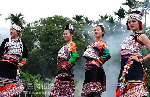 模特在展示花腰傣民族服饰(10月1日摄)。“十一”黄金周期间,云南省新平彝族傣族自治县举办以“穿在身上的艺术、写在身上的历史”为主题的花腰傣民族服饰文化节,向前来观光旅游的中外游客展示了数百套亮丽多姿、别具特色的花腰傣民族服饰。 新华社记者 陈海宁 摄