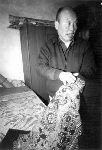 印染店的铺子,在熊希龄(民国总理)故居旁,说是铺子其实非铺子,屋里挂着一块招牌布, 黄永玉先生(中国当代著名画家和散文家)题的"刘大炮染匠铺"几个字是用蜡染做出来的。卧室,墙角有幅黄永玉的画, 上书:大炮在此,百无禁忌。大炮双手叉于胸前,光头上楞起几根发茬,历历可数。线条古拙俭省,人物棱角分明的个性却跃然。 屋内挂满了刘大炮亲手制作的印染布,全是传统图案:鱼跃龙门、刘海戏蟾、松鹤延年、凤凰牡丹……那些传统图案是刘大炮历经了几十个春秋, 从民间收集整理创作而成。版上的图案,都是大炮自己绘、自己刻的,好几十幅,从前传下来的老样子,十几岁他做学徒就摸熟了, 文革当中给毁了,后来慢慢重刻的。
