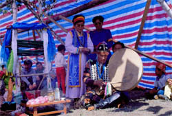 萨满的主要宗教仪式是跳神和求神。从前鄂温克人有病就请萨满跳神治病、驱鬼。萨满到病人家之后,先为诸神烧“刚嘎”或“申克日”(蒿草),然后烤神鼓,穿神衣,左手持神鼓,右手持槌,双眼紧闭诵咒,祈祷请神,鼓声逐渐增快。首先颂扬氏族起源,其次传问病因病根。萨满“神灵”附体后,大声怒喊驱逐病魔,然后去门外用弓箭射鬼偶(草扎的)。赶鬼仪式告终,病人精神振作,感觉病情好转或已愈。另一种是“奥米那仁”(即五月祭神会),这是一项重要的宗教活动,是比较隆重的集会。“奥米那仁”有两个内容:一个是老萨满领教新萨满,另一个是祈求全莫昆(大家族)、哈拉(氏族)平安。“奥米那仁”一般进行3天,但必须在萨满家举行。“托如”为祭神树,即在院内立1棵桦树、屋内立1棵柳树,两棵树之间拉上一条“松那热”围绳,树枝上挂许多五颜六色的绸布条或布条。“奥米那仁”必须有两个萨满跳神,一个是本莫昆萨满,另一个是请来的外族萨满,被请来的萨满为师。集会时将全莫昆的男女老幼都在两棵树的中间集合起来,用狍脖皮制成的皮绳子把人们紧紧围起来,如果皮绳比原来短了,即预示将发生疾病或人口减少。“奥米那仁”一般每年举行一次。