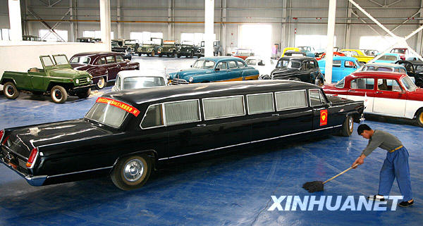4月9日,在雒文友的“老爷车”博物馆内,一名工作人员在长度约为10米的加长“红旗车”旁打扫卫生。新华社发(卜向东 摄)