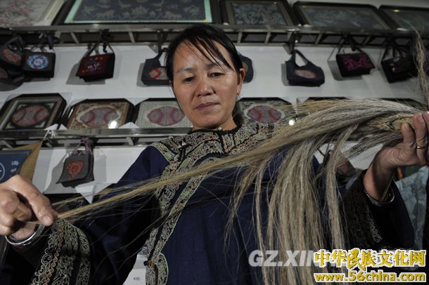 水族马尾绣是水族妇女世代传承的一种特殊刺绣技艺,以丝线缠裹马尾进行缝制。据悉,水族马尾绣入选第一批国家级非物质文化遗产名录,是水族地区现存的一种原始艺术,被称为中国刺绣的“活化石”,是研究水族民俗、民风、图腾崇拜等民族文化的珍贵资料。以丝线裹马尾刺绣图案的好处是马尾质地较硬,能使图案不易变形;马尾不易腐败变质,经久耐用;还有马尾上含有油脂成分,利于保养外围丝线光泽。现在,马尾绣产品远销新西兰、意大利等地,已成为水族同胞致富的新途径。</font>