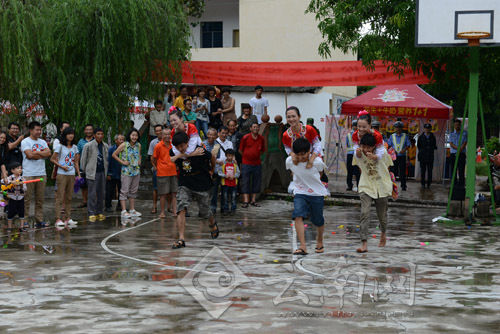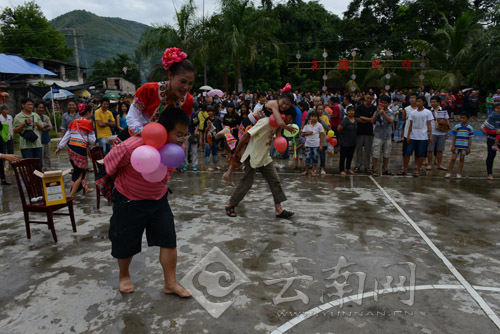 欣赏完上午的民族风情展演,品尝好傣家人的美食,下午的活动就更吸引人了。您瞧,这边的背新娘比赛开始了,游客们都踊跃的参与到比赛中来当新郎,美丽的小仆少则由“新郎”背着到对面拿气球,哪一对“新人”在规定时间内拿到的气球最多,哪对新郎就可以得到一盒装着咸鸭蛋、干黄鳝、腊肉等傣家美味的秧箩饭。</p>