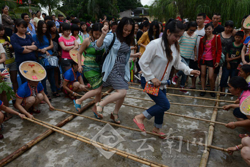 这边的背新娘比赛进行得紧张激烈,那边跳竹竿活动现场也欢声笑语不断,富有节奏的竹竿敲打声,已经把许多游客吸引过去了,有不少游客能跟着节拍顺利过关,而有的游客或许是掉以轻心,没跳几下就被竹竿夹住了脚。看到跳竹竿活动充满了情趣,越来越多的游客已积极参与到活动中,整个现场都充满了快乐的气氛。<br />