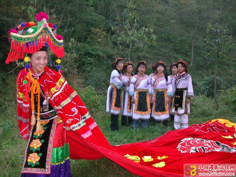 贵州彝族姑娘“亮”嫁妆 2010年11月9日,贵州省盘县淤泥河乡麻郎垤村彝族聚居村,彝族姑娘为游客展示了一款独特新娘装,长达6米的大红披风,吸引了不少游客的目光。 据了解,彝族女子的嫁妆,全靠手工桃花和刺绣做成,做一套漂