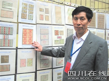 胡国荣展示他的喜糖票 一套泛黄的老粮票,看似毫不起眼,却有人开出10万元“天价”求购!昨日,人民中路人民饭店内,四川粮票第二届票证交...