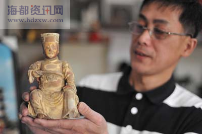 老蔡和他收藏的郑成功木雕像 米螺筛有点像犁 北门街老蔡想把珍宝亮给厝边看 宋朝指南针、明代郑成功木刻雕像、清初弦管瓷雕…...