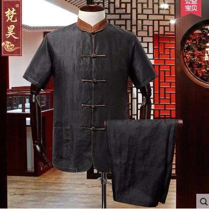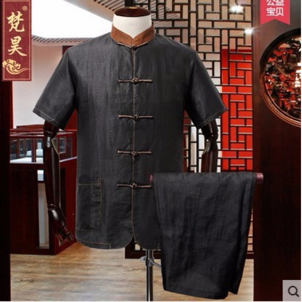 • 商品名称:香云纱唐装男套装 中老年男款真丝短袖套装