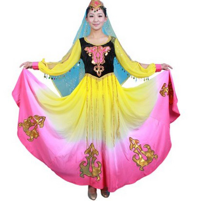 • 商品名称:黄色新疆维吾尔族舞蹈演出服 大裙摆