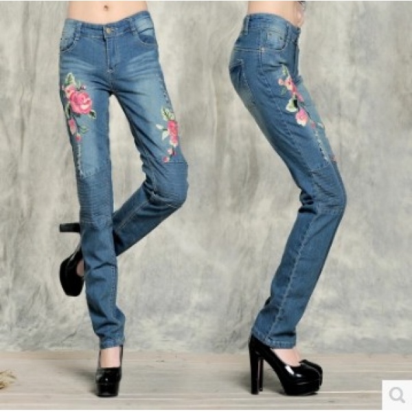 民族风女裤 绣花修身显瘦中腰牛仔裤 长裤