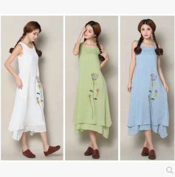 • 商品名称:文艺范棉麻荷花印花假两件不规则连衣裙长裙