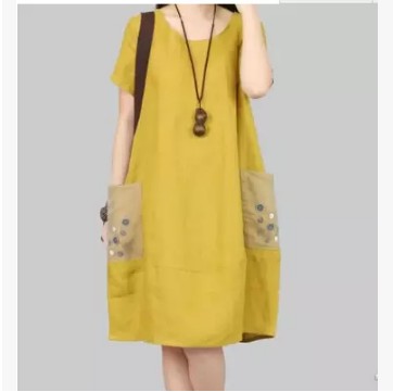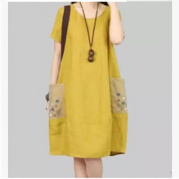 • 商品名称:纱网纽扣装饰大口袋短袖亚麻裙 棉麻连衣裙