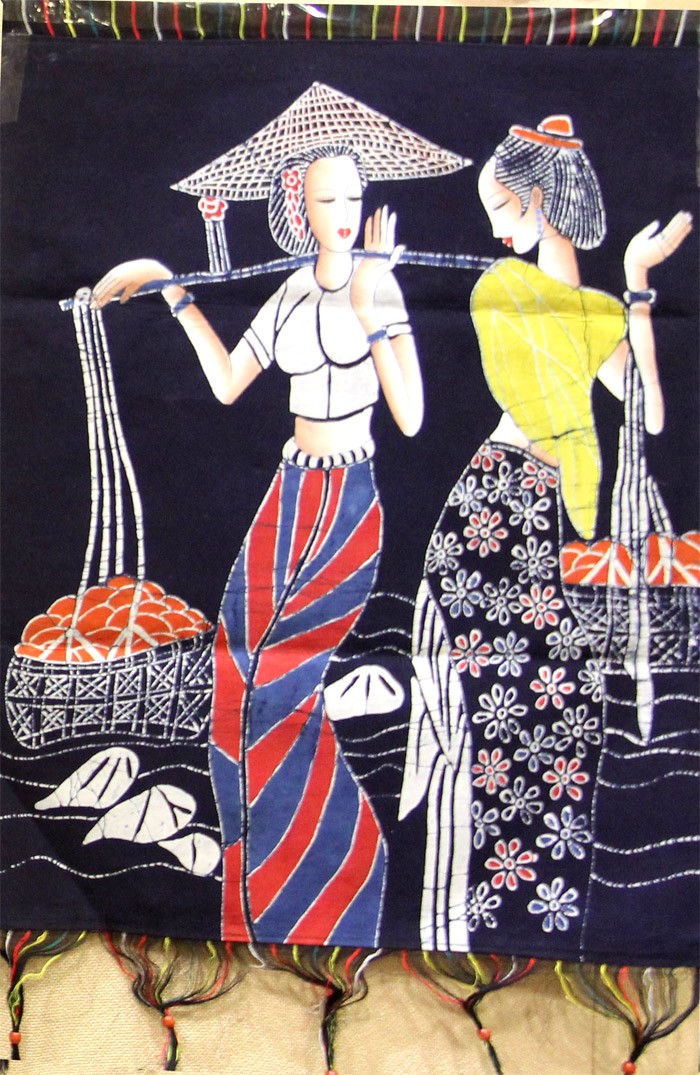 重彩画重彩技术跟蜡染工艺结合的工艺品,是用优质白布在染缸里用靛蓝(苗族专用染料)染成深蓝色。然后蜡染师傅在上面绘出各种艳丽的图形。在装婊于下方有穗穿上珠子的布上。它具有颜色丰富、艳丽,线条突出,色彩丰厚,少数民族风情和历史文化,具有浓郁的民族的地方特色。