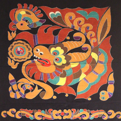 重彩画重彩技术跟蜡染工艺结合的工艺品,是用优质白布在染缸里用靛蓝(苗族专用染料)染成深蓝色。然后蜡染师傅在上面绘出各种艳丽的图形。在装婊于下方有穗穿上珠子的布上。它具有颜色丰富、艳丽,线条突出,色彩丰厚,少数民族风情和历史文化,具有浓郁的民族的地方特色。