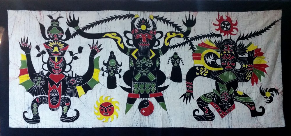 重彩画重彩技术跟蜡染工艺结合的工艺品,是用优质白布在染缸里用靛蓝(苗族专用染料)染成深蓝色。然后蜡染师傅在上面绘出各种艳丽的图形。在装婊于下方有穗穿上珠子的布上。它具有颜色丰富、艳丽,线条突出,色彩丰厚,少数民族风情和历史文化,具有浓郁的民族的地方特色。
