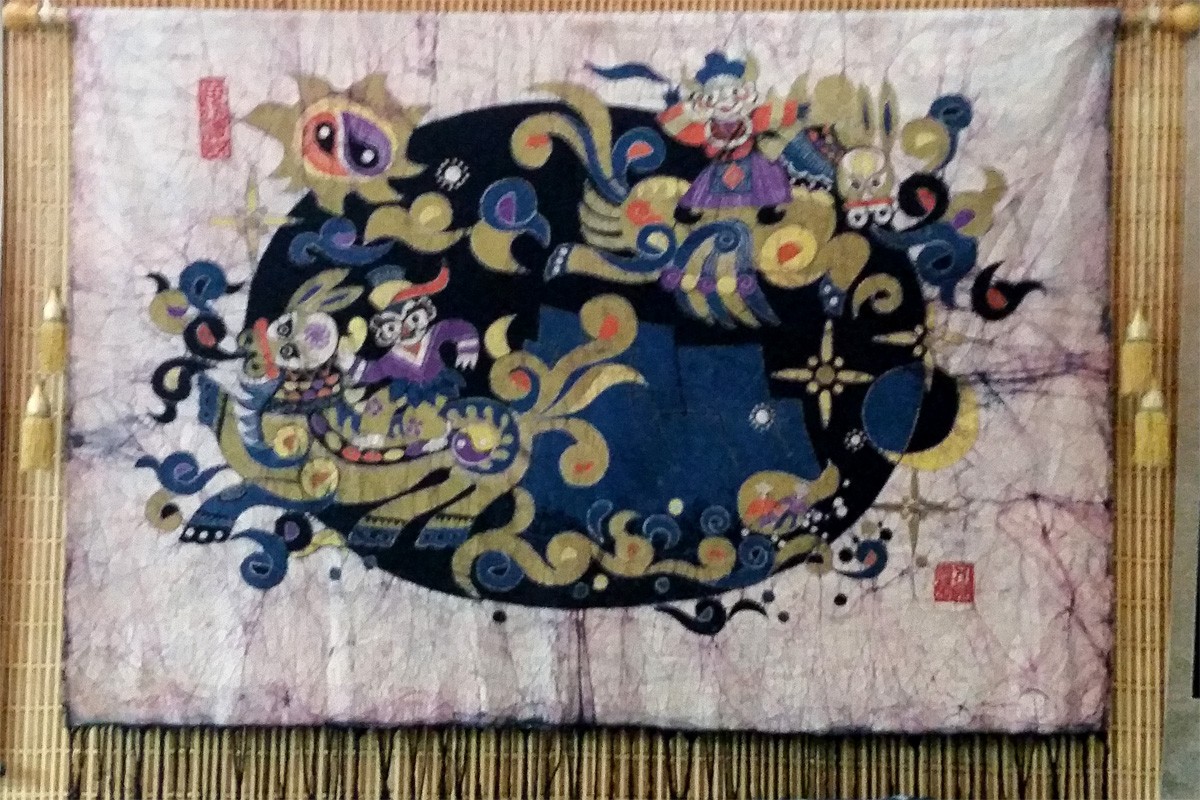 重彩画重彩技术跟蜡染工艺结合的工艺品,是用优质白布在染缸里用靛蓝(苗族专用染料)染成深蓝色。然后蜡染师傅在上面绘出各种艳丽的图形。在装婊于下方有穗穿上珠子的布上。它具有颜色丰富、艳丽,线条突出,色彩丰厚,少数民族风情和历史文化,具有浓郁的民族的地方特色。