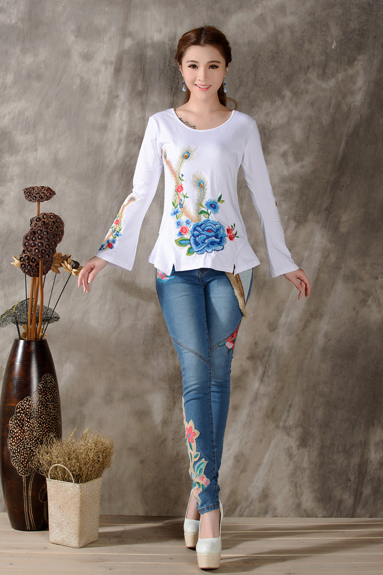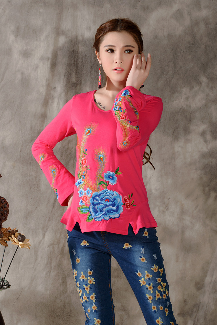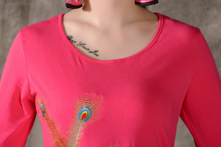 • 商品名称:民族风 休闲绣花开叉下摆 圆领长袖t恤打底衫